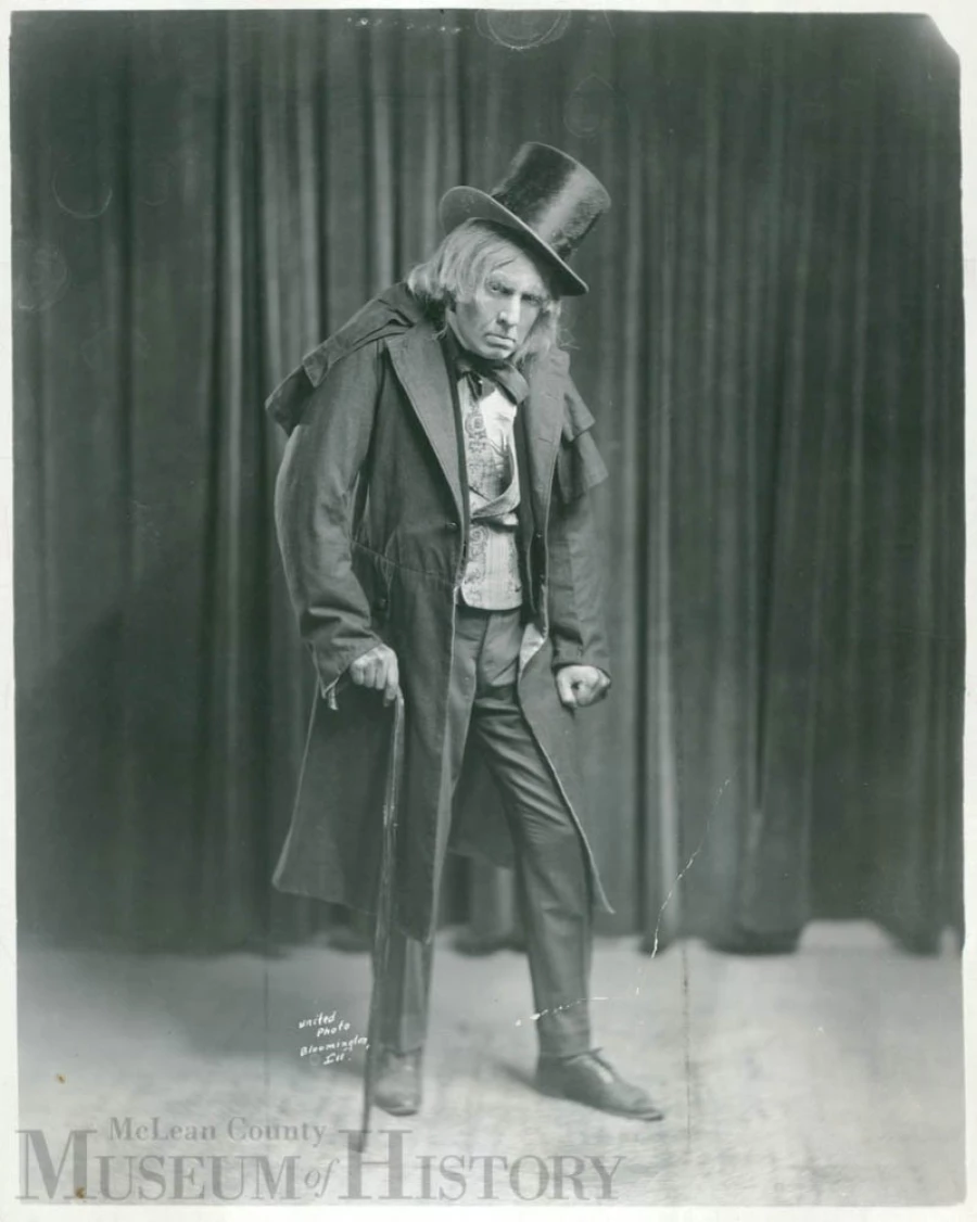 From this 1926 publicity still we’d have to say Bloomington’s Fred Hitch captured the essence of the character Charles Dickens described as a “squeezing, wrenching, grasping, scraping, clutching, covetous, old sinner!” From the mid-1920s into the 1990s, the Scottish Rite Temple (now the Bloomington Center for the Performing Arts) staged a version of the “A Christmas Carol.”This adaptation of the Dickens’ classic was one in a series of ambitious theatrical productions created by Delmar D. Darrah. The late Bloomington Masonic leader and theater impresario is best known for “The American Passion Play,” which holds its 93rd consecutive season in the spring of 2016 (Fred Hitch played the Passion Play’s Jesus for many years). Back in 1926, performances of Darrah’s “A Christmas Carol,” featuring an impressive cast of 150 actors and extras, were held Dec. 12, 17, and 19.