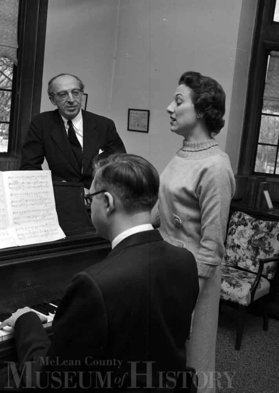 Composer Aaron Copland was the featured guest for Illinois Wesleyan University's Seventh Annual Symposium of Contemporary American Music, held in mid-February 1958. kemCopland, one of the greatest American artists (music other other-wise) of the 20th century, is seen here listening to R. Dwight Drexler, professor of piano and theory, and his wife, Maxine, prepare for a performance of Copland’s “Twelve Poems of Emily Dickinson.”