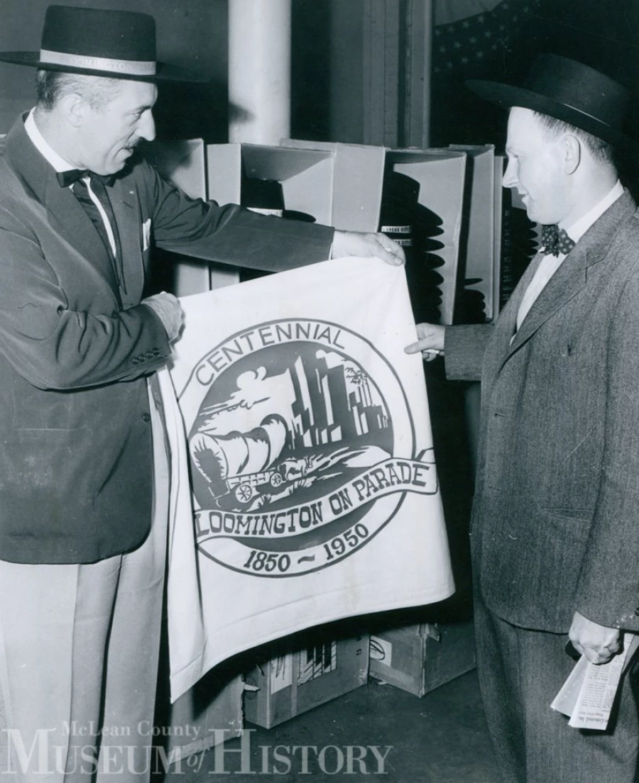 The celebration’s signature event was “Bloomington on Parade,” described as a “mammoth spectacle” featuring a cast of 750 area residents and staged at Illinois Wesleyan University’s Memorial Stadium (known as Tucci Stadium today). Seen here is Vance Packard of The American Magazine (right) receiving a section of centennial bunting from Lawrence Nordine, one of the event’s organizers. Packard was in town to write a story on the week-long celebration for his national publication.