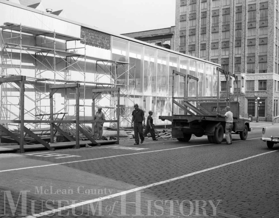 This view, from East Street looking northwest, shows the “new” Bloomington Federal Savings & Loan Association building under construction some three months before its grand opening in November 1957. Designed by visionary architect A. Richard Williams, additions to this bank building were made in the 1970s and 1980s.The bank complex reopened in 2004 as the City of Bloomington / County of McLean Government Center.