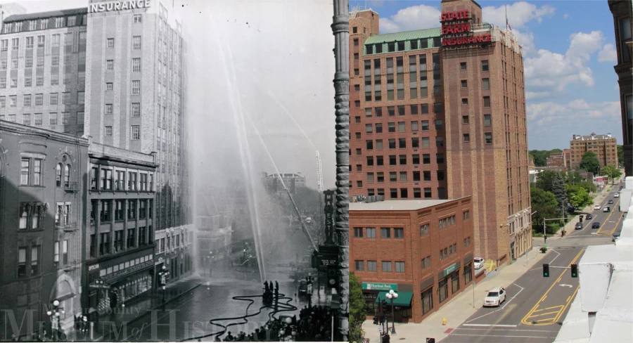 No need to panic! The State Farm Insurance Co. downtown building was not ablaze in mid-December 1939. This was a BFD public demonstration of new engines and equipment, including an 85-foot Seagrave aerial ladder truck.This scene shows the 100 block of East Washington Street. Old Withers Library is visible across East Street and behind the water spray. The photo on the right shows a similar angle, circa 2014.