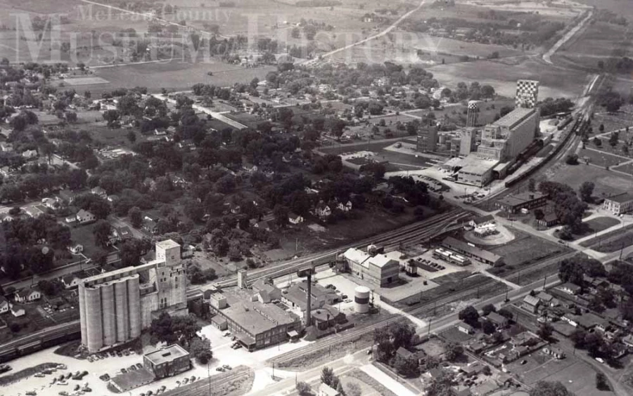 At the time of this photograph, Funk Bros. Seed Co. operated the grain silos and complex of buildings seen in the lower half of this view. The plant in the upper right shows a Ralston-Purina Co. facility. Today, the Funk Bros. silos are home to Upper Limits, the popular climbing gym. Cargill, Inc. now operates the Ralston-Purina site. What else do you see here?