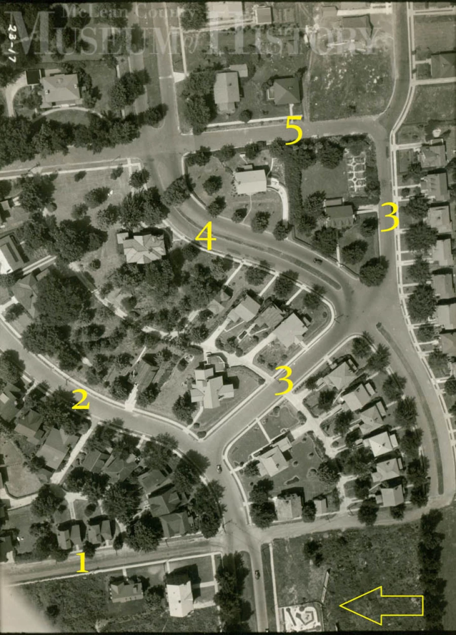 Here’s a fascinating view of the Cedar Crest neighborhood in Normal from the Depression era. If you’re having trouble orientating yourself, No. 1 marks Division St.; No. 2 Clinton Place; No. 3 Hillcrest St.; No. 4 Broadway Place; No. 5 Highland Avenue. Also note the arrow. It points to miniature golf course once located on the 1500 block of N. Clinton Blvd!