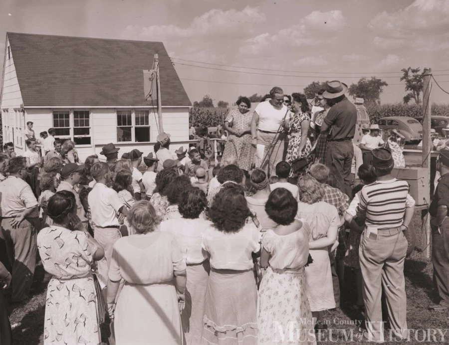The most recent Sunday Pantagraph “Page from Our Past” installment examined the fascinating history of Chenoa airport, which opened in 1947 as McLean County’s second commercial airfield (after Bloomington’s).Here are two more photographs from the rural airport’s second annual air show, held August 29, 1948. Air show emcee Tommy Bartlett (in the white T-shirt) can be seen in the first photograph regaling some of the 2,500 spectators that gathered on the grounds to watch some 50 private planes spend the day on the airfield’s turf runways or in the skies above. Bartlett, who at the time was a Chicago radio personality, would soon enjoy much greater fame as a water skiing impresario based in the Wisconsin Dells.