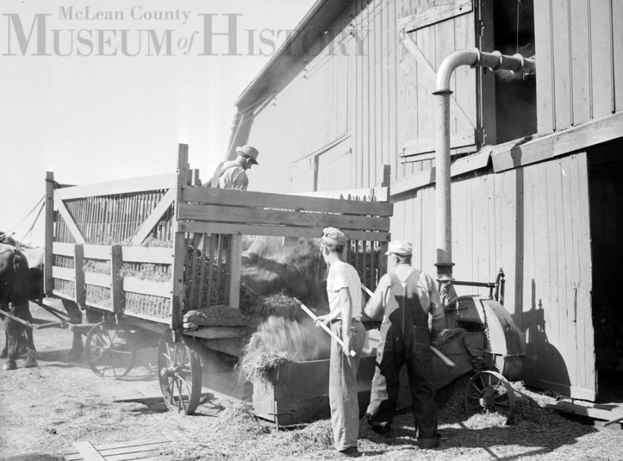 Farmers have always been innovators willing to try out new methods and adapt new technologies. Back in June 1941, E.D. Lawrence, who farmed the Brown estate ten miles east of Bloomington, experimented with blowing chopped hay in the barn mow instead of moving baled hay the traditional method.Seen here are John Hines (right) and his son Bob forking hay into the blower. That’s George Dill on the wagon.