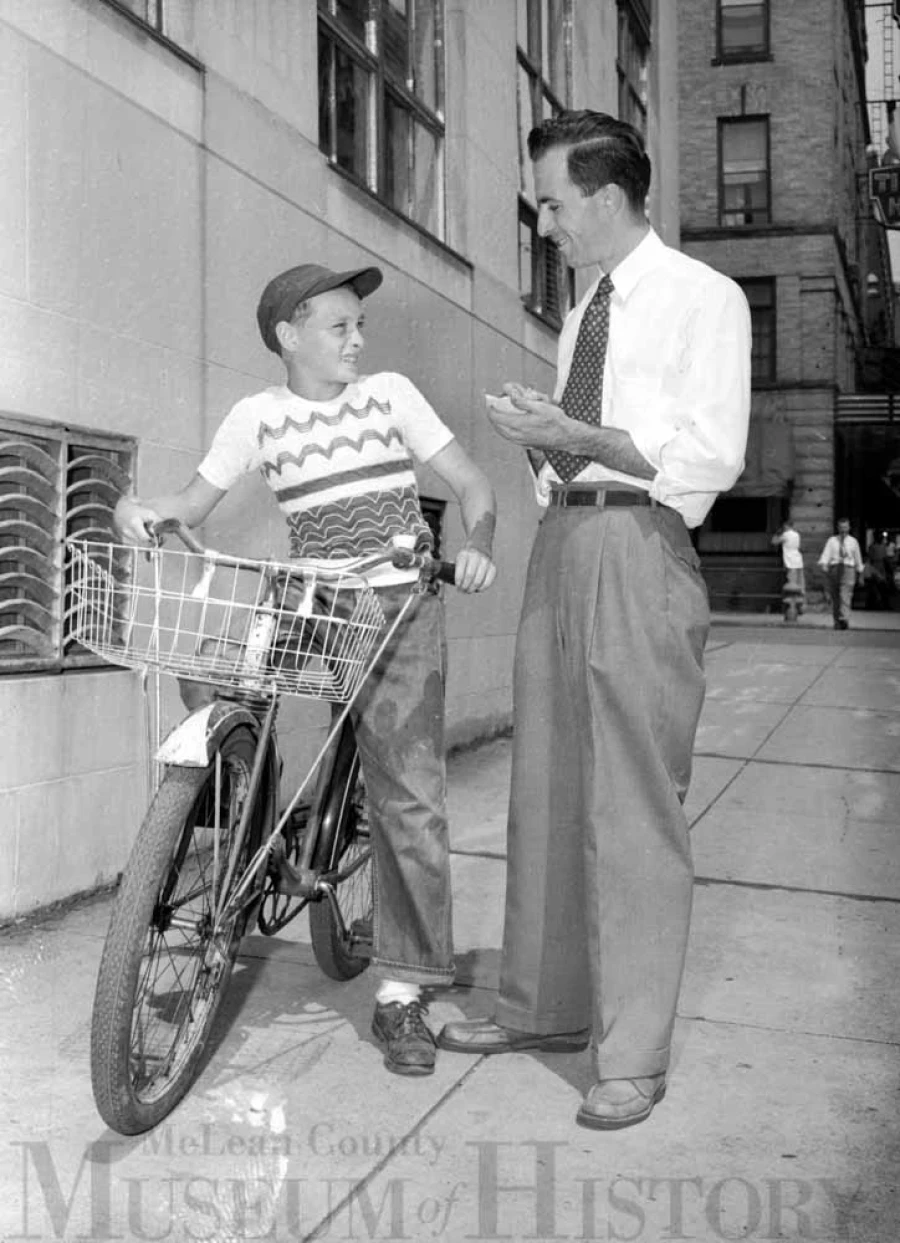 In late June 1951, the Junior Chamber of Commerce sponsored a “Traffic Courtesy Week” in Bloomington-Normal. The event included giving away $5 to those who exhibited courteous behavior to fellow motorists and pedestrians. Here’s Gene Paxton of Paxton Typewriter Co. talking to 13-year-old Ronnie Rider of Bloomington. Ronnie was a $5 winner for stopping his bicycle to let a woman burdened with packages get to her car.