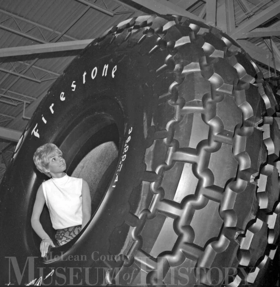 Janet Froemming, receptionist at the Firestone Tire & Rubber Co. (now Bridgestone Tires) plant in Normal, gets a close look at a tire produced for the U.S. Army’s latest generation amphibious vehicle known as the LARC (Lighter, Amphibious Resupply, Cargo). These LARC tires were first shipped to the Army Depot in Polk, CA on May 29, 1968.