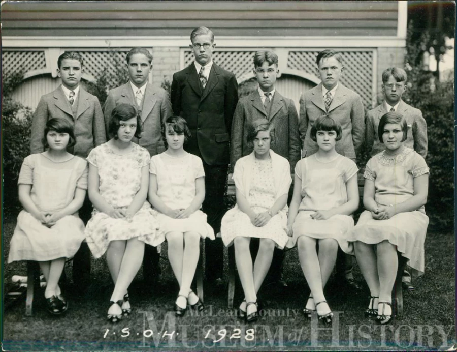 Twelve eighth grade graduates from the Illinois Soldiers’ Orphans’ Home (later renamed the Illinois Soldiers’ and Sailors’ Children’s School, or ISSCS) pose for this late spring 1928 photograph. Unfortunately, the only students positively identified are Richard Griffith (middle, back row) and Thelma Capshaw (second from left, front row). If you know anyone else shown here please contact Museum Librarian Bill Kemp at BKemp@mchistory.org. ISSCS, a state-run home located in north Normal, closed in 1979.