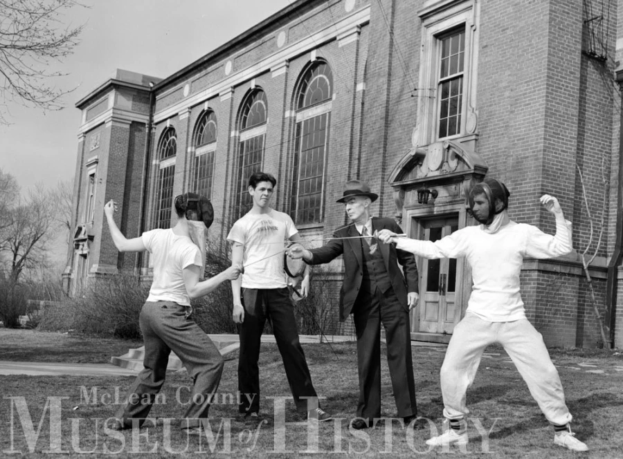 In the spring of 1941, fencing became the newest sport on the Illinois Wesleyan University campus. Seen here are Prof. R.M. Chase giving pointers (pun intended) to Russell Stickney (left) and Bill Trierweiler. Looking on is Robert Lucey, captain of the fencing group. It was said that in his undergraduate days, Prof. Chase was a champion “in the foils.”