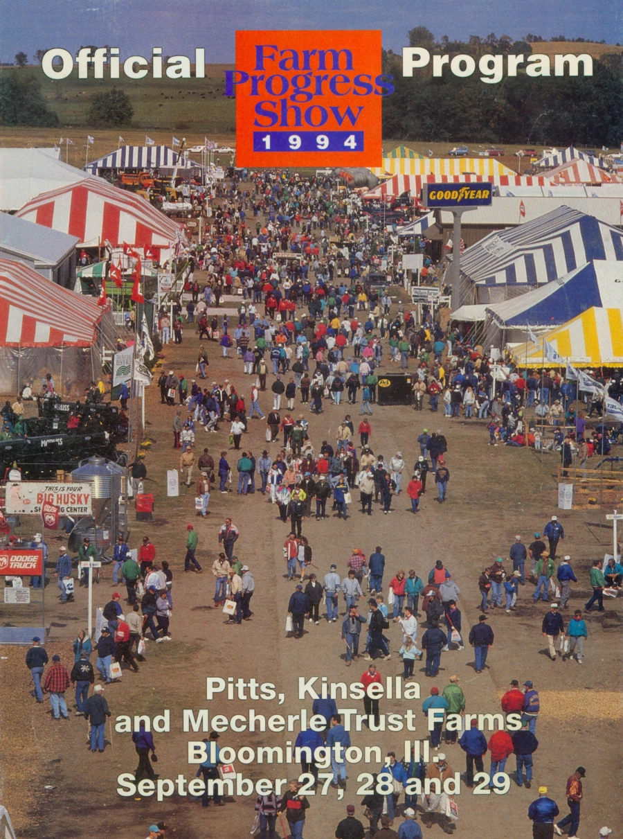 It was arguably the single largest event ever staged in McLean County history. Despite the cancellation of the first day due to muddy field conditions, the 1994 Farm Progress Show attracted an estimated 150,000 folks to the G.J. Mecherle Trust Farm off Illinois Route 9 several miles east of Bloomington.The annual show is billed as the oldest and largest outdoor agricultural equipment exhibition in the U.S. It now rotates between dedicated grounds known as “Progress City” in Decatur, IL, and a site in Iowa. The 2015 show was held September 1-3 in Decatur.Seen here is the official 1994 program, which is held in the Museum Archives. Who among us was out there at the Mecherle Trust Farm that year? We’d love to hear your story!