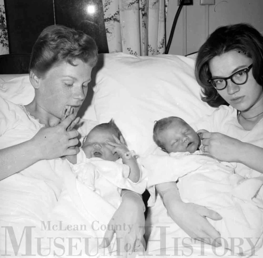 Shirley Agner (left) holds her as-yet unnamed newborn son, who arrived on the scene at 12:37 a.m., Jan. 1, 1965, fully five minutes ahead of Brian Keith Oesch, who is being held by his mother Judy Oesch (right).The Agners were from Fairbury, in Livingston County, while the Oesch family lived on Willow Avenue in Normal. Both births took place at Mennonite Hospital.