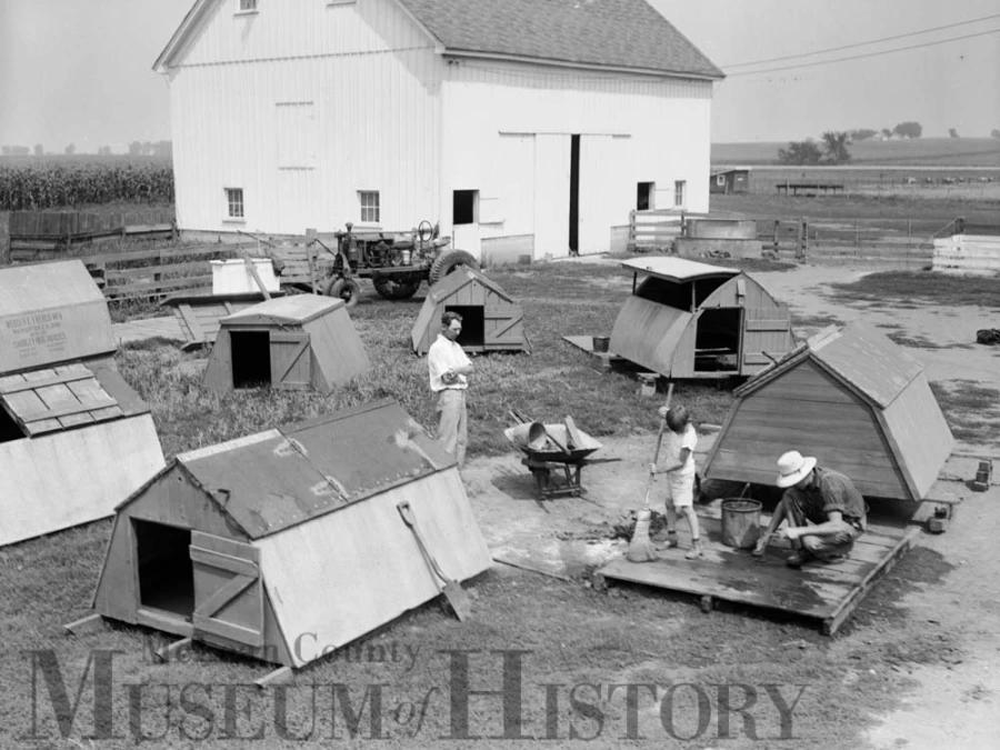 Henry E. Klafke (presumably standing with his arms crossed) was a Normal Township breeder of Duroc Jersey hogs. He’s seen here watching over the scrub down of his hog houses in preparation for fall litters. Such cleaning was an important step in the “McLean County System of Swine Sanitation” developed to combat pervasive roundworm infestations.The Klafke family would sell this land in 1964 to make way for the Firestone Tire & Rubber Co. plant (now Bridgestone).