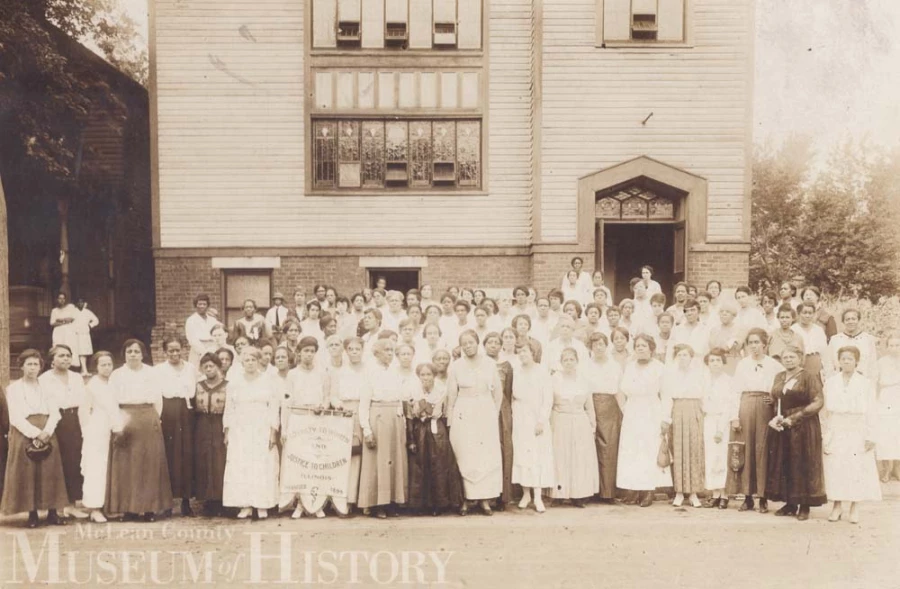 The Illinois Federation of Colored Women’s Clubs held its nineteenth convention in Bloomington in late August 1918. Seen here are convention goers gathered before Wayman African Methodist Episcopal (Wayman A M E Church) Church at 804 N. Center St. The banner reads: “Loyalty to Women and Justice to Children.”Wayman Church is now located on the city’s west side, 803 W. Olive St. The building shown here is now Faith Baptist Church.