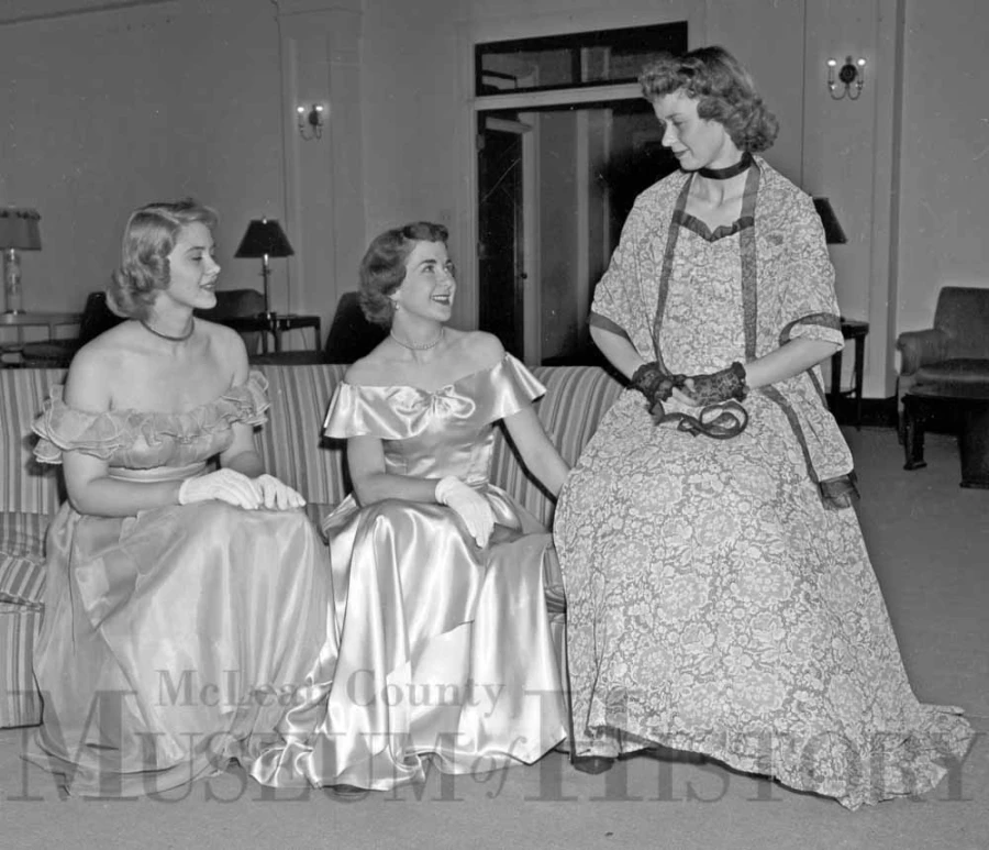 Several ISNU coeds show off their gowns for the June 10, 1949 junior-senior prom. Louise Claymore (left) is in a blue chiffon; Barbara Schonert (center) in blue satin; and Marilyn McCarthy in beige lace with a stole.