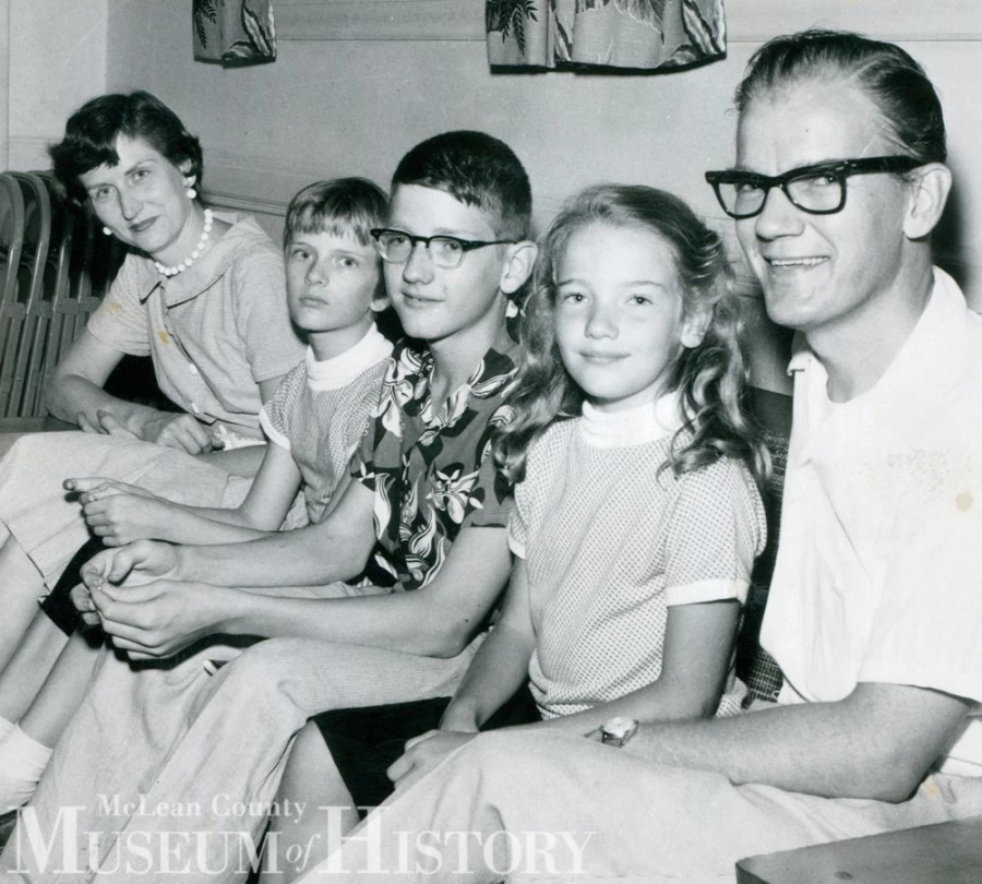 After twelve years as a Pantagraph reporter, Gerald “Jerry” Sohl (left) decided to pick up his family and head to California to become a full-time science fiction and fantasy writer.Seen here are his wife Jean Gordon, son Allan, and daughters Marty and Jennifer (we’re not sure who’s who, daughter-wise). Sohl already had nine novels published and would become a successful television scriptwriter. Once out West he wrote episodes for “The Twilight Zone,” “Alfred Hitchcock Presents,” “The Outer Limits,” “Star Trek: The Original Series”,” and others.His more popular sci-fi novels included “The Haploids,” (1952), “Costigan’s Needle” (1953), and “The Time Dissolver” (1957).