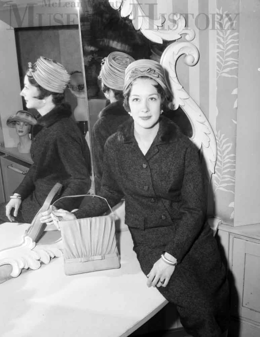 On February 8, 1959, The Pantagraph featured photographs of local women wearing the latest in fashionable hats. Seen here is Lea Kallish of Bloomington sporting a tall, linen-like, straw cloth hat. Although this photo is in black-and-white, we’re told the hat’s color was known as “cherry fizz.” The purse is made of the same material. “Yellows, rose colors and bright blues are spring’s leading shades in accessories,” noted The Pantagraph.