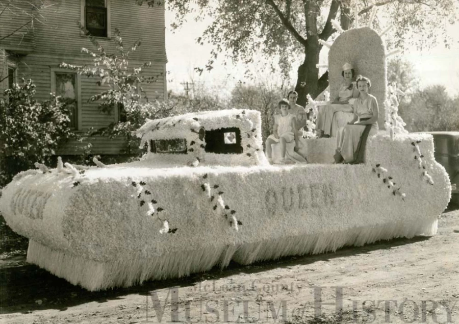 This photo was taken of the LeRoy Centennial parade, held back in 1935. Rose Mae Bishop (seated) served as centennial queen. Margaret Adams and Ellen Skillman were the queen’s attendants, but we don’t know who’s who. The little girl is Jean Clarey, the honorary attendant.