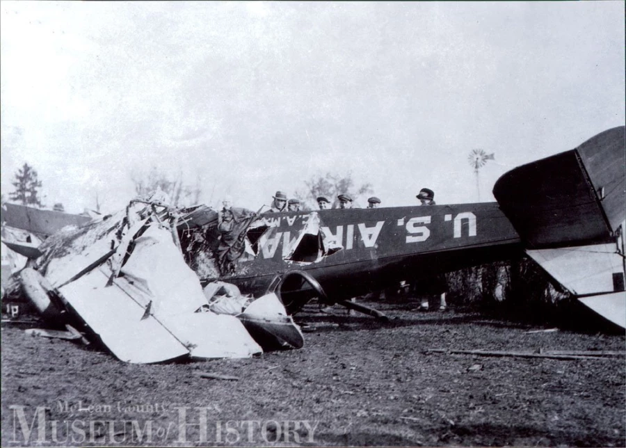 Flying blind and out of fuel at 13,000 feet, a 24-year-old “Lucky Lindy” parachuted into the inky darkness and blowing snow. He landed unharmed at a farm just outside of Covell, an unincorporated community southwest of Bloomington. Meanwhile, his doomed, pilotless aircraft had crashed nearby.