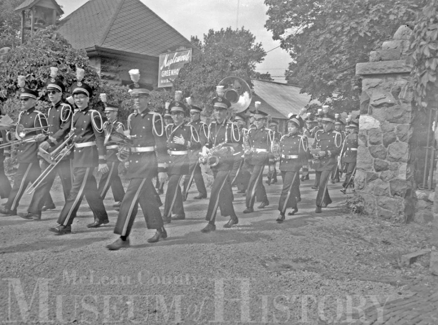 The Bloomington High School marching band passes through the gates of Evergreen Memorial Cemetery on Bloomington’s south side for a Memorial Day program. “Our nation, our young men of necessity, play a role in the tragic drama now a part of current world events on this Memorial Day,” Edward B. Akin of the Illinois Veterans’ Commission told those gathered for a ceremony at the cemetery.