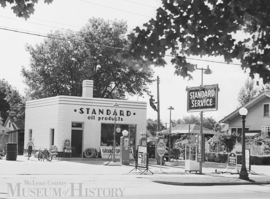 This Standard Oil Co. service station, 1507 South Main Street, Bloomington, opened on July 29, 1939. The modernistic design sparkled with its glazed brick and terra cotta exterior and a color scheme of cream, blue, and red. Denver Aldridge leased the station from Standard Oil and served as manager. It remained a Standard station into the late 1950s, and though it’s not known when this handsome, utilitarian building was torn down, by the early 1960s, 1507 South Main Street was home to E&J Auto Sales. Today, this lot is occupied by the tavern Bonkers Place.