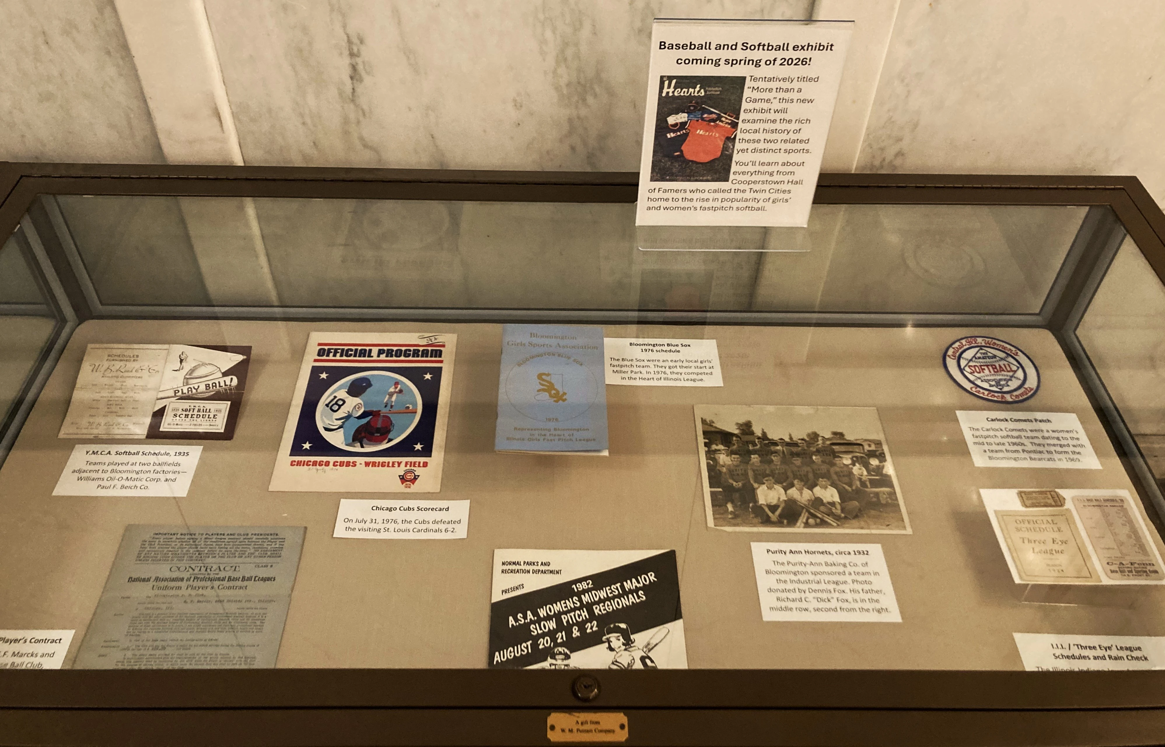 The display case of the east side of the hallway features a selection of items encapsulated by intern Frankie Gordey this spring. Encapsulation protects items in acid-free archival plastic, which prevents tearing or cracking. Encapsulation is not to be confused with heat-sealing lamination, which damages paper by sealing it in harmful, acidic microclimates. By contrast, encapsulation lets paper "breathe," which, when coupled with storage in climate-controlled environments, can significantly extend the life of delicate paper items. Frankie diligently encapsulated over a dozen archival items during his internship, in addition to organizing and inventorying other archival collections, such as the McLean County Health Department. Frankie is completing a master's degree in library science through the University of North Texas, though he makes his home in the Twin Cities.