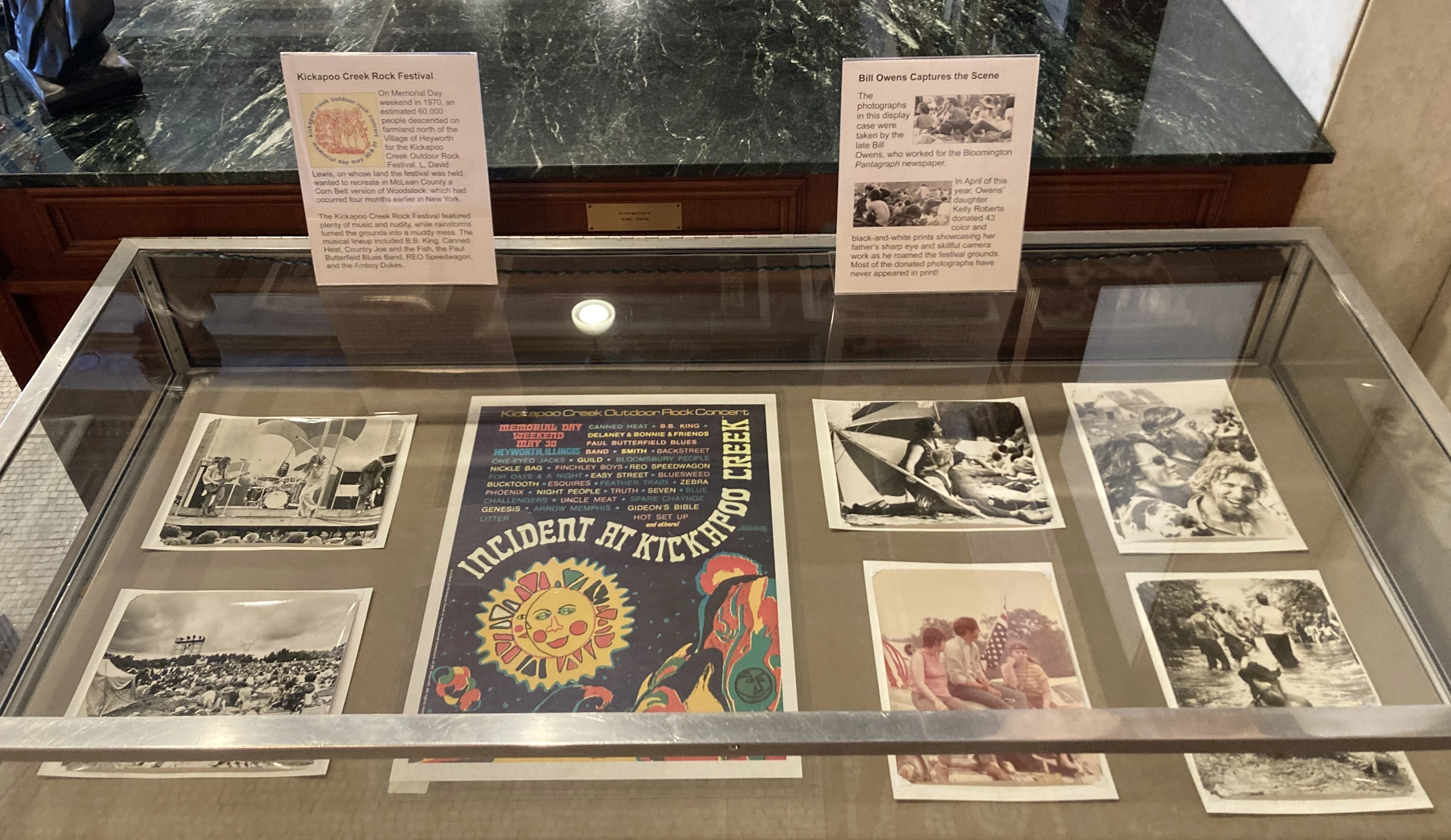 The late Bill Owens, who worked for the Bloomington Pantagraph newspaper, took the photographs in this display case. In April of this year, Owens' daughter, Kelly Roberts, donated 43 color and black-and-white prints showcasing her father's sharp eye and skillful camera work as he roamed the festival grounds. Most of the donated photographs have never appeared in print!