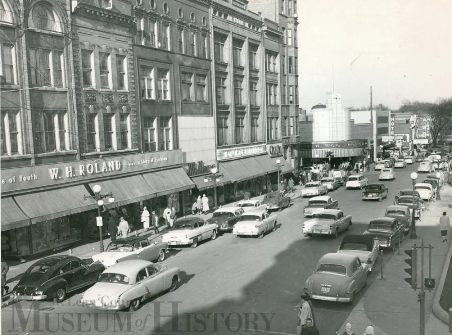 Here’s a wonderful view of the 100 block of West Jefferson Street, or the north side of the Courthouse Square. Pictured here are Roland’s and Klemm’s, two longtime local retailers. Looking east down Jefferson Street one also gets a look at Woolworth’s, the Auto Hotel, and the Irvin Theatre.Those were the days! Who remembers downtown from the 1950s?