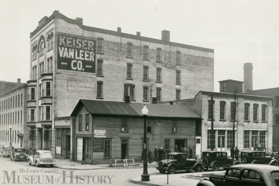 Seen here is the northeast corner of East and Market streets in downtown Bloomington, late 1935 or early 1936. Keiser-Van Leer Co., a mechanical contractor and hardware dealer, was preparing to demolish the two-story buildings in the foreground (both the wood frame and brick structures) to make way for a two-story Streamline Moderne addition. The five-story structure looming over the doomed buildings was to undergo a significant facelift as well, with its exterior matching the new addition. The talented Bloomington duo Archie Schaeffer and Phillip Hooton served as architects.The Keiser-Van Leer building and addition later became home to Clark and Barlow hardware store. Today it’s occupied by East Street Hardware and Tools.