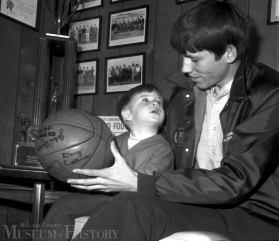 Illinois State University's Doug Collins holds an autographed ball featuring the signatures of players, coaches, and team personnel from the 1972 U.S. Olympic basketball team. Three-year-old Patrick Dowd of Normal, whose family purchased the souvenir as part of a September 5 fundraiser for St. Joseph's Hospital in Bloomington, shares a chair with the hoops superstar.Collins played a key role on the hard luck U.S. squad during the 1972 Olympics in Munich, West Germany. The American collegians (there were no "Dream Team" professionals back then) lost to the Soviet Union in the controversial gold medal game in which the final three seconds were replayed twice, or enough extra time to give the U.S.S.R. a 51-50 victory. In protest the U.S. refused to accept their silver medals. Collins, an all-American at ISU, was the first pick in the 1973 National Basketball Association draft. Today he's an NBA television analyst and an adviser to the Philadelphia 76ers.