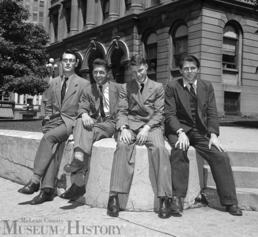 The Beatles didn’t arrive in the U.S. until February 1964, but some 14 years earlier Bloomington-Normal experienced its own British Invasion of sorts. Seen here are British foreign exchange students (left to right) Anthony Lodge, Ian Humphreys (though in local news coverage Ian’s last name was also spelled Humphries), Michael Wasilewski, and Alan Evans. They’re posing for The Pantagraph photographer at the McLean County Courthouse Square in downtown Bloomington, sometime on June 30 or July 1, 1950. The four young men were staying in the Twin Cities until August 11, and while here were enrolled at either Illinois State Normal University or Illinois Wesleyan University.