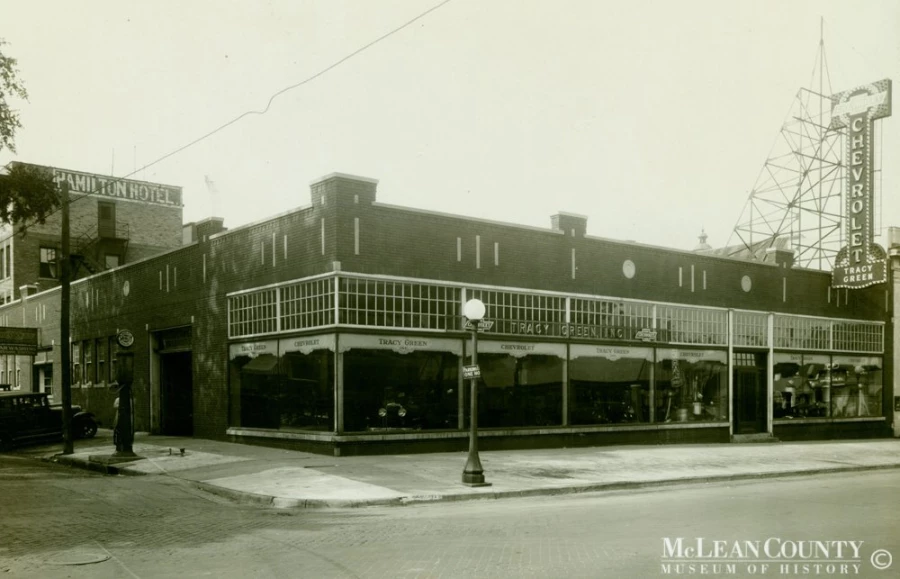 Tracy Green & Co., circa 1928, located at the southwest corner of Washington and Gridley streets east of downtown Bloomington. In the 1930s and into the 1940s, this Chevrolet dealership was known as Green/Wells Inc.. By the late 1940s it became Tracy Green Motors, with the business closing in the mid-1950s. In its last years it was an authorized dealer for Studebaker-Packard automobiles. Today this city block is occupied by the old Union Insurance Group building, which now serves as a data center for A5, a Peoria-Bloomington internet / communications provider.
