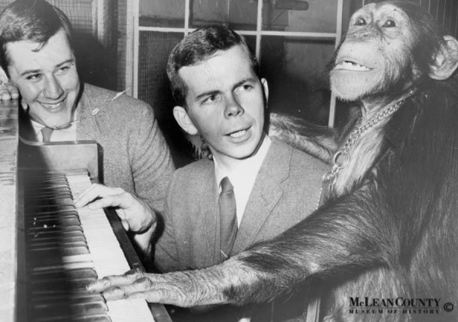 I stumbled across this photograph while perusing a collection of recently donated photographs. I knew that the smartly dressed figure in the middle was Don Munson, the now-retired on-air WJBC AM 1230 morning radio personality. Without knowing the context of this curious find, I decided to email Don Munson, who still lives in Bloomington-Normal and hosts a delightful Thursday evening jazz program on WGLT FM 89.1, Illinois State University's Public Radio affiliate. See below for Don's comments about this photo. For the record, I think the shot was taken in 1968. LaJean, the popular Miller Park Zoo chimp, flanks me on one side and Michael Iseberg, owner of a Wurlitzer retail store in the newly opened Eastland Mall [Bloomington], is the other guy. The pic was to promote a fundraiser for some charity at today's Center for the Performing Arts [formerly known as the Consistory or the Scottish Rite Temple] during which it would be determined whether LaJean or WJBC's morning man, Munson, was a quicker study with regard to playing a Wurlitzer organ. Iseberg had been giving us both lessons. I have erased from memory who learned better, likely because it wasn't me. I had no musical background whatsoever, but managed to learn and play a couple of simple tunes before what I recall was a pretty big audience. I don't remember LaJean's performance, but I do believe Iseberg proved his point: "If Munson and a monkey can learn to pay a Wurlitzer, then you can, too." Iseberg handled the bulk of the entertainment that day, playing the mighty Wurlitzer. Everybody who had visited the new Eastland had heard his booming rendition of the William Tell Overture filling the Mall. The guy [Iseberg] was a promotional genius. He and I had brainstormed The Great Piano Marathon in 1967 opening Eastland, and The Great Race between Joliet and Bloomington in 1968. I don't think the area has seen anything to top those events since.