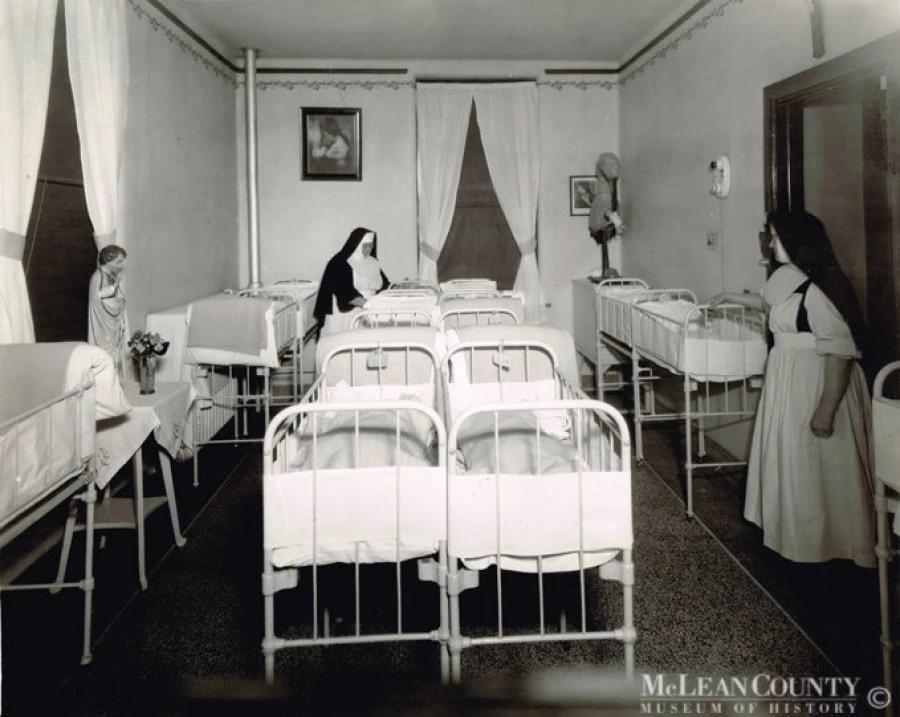 Newborn Nursery, St. Joseph's Hospital, Bloomington 1929. Seen here are Sisters M. Eligia Trumper (right) and M. Aloysia Plum in the newborn nursery at old St. Joseph's Hospital, back when it was located on Bloomington's west side. Note the stork in the back corner and the Christ Child statue opposite Sister Trumper. In 1968, St. Joseph's relocated to the city's far east side along what is now Veterans Parkway. Today, the hospital is known as OSF St. Joseph Medical Center
