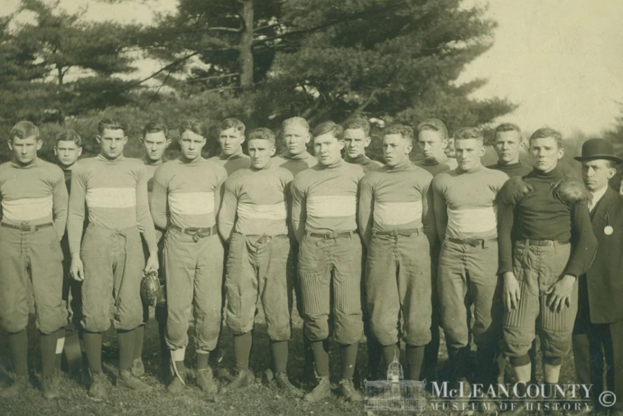 Pictured here is the 1915 University High School football team. The “U Men" (the school nickname “Pioneers" was still a long way off) went 4-3-2 that season, with wins coming against Paxton, Urbana and Normal (twice); loses to Joliet, Decatur and Peoria Manual; and ties with Champaign and Springfield. The players are unidentified in this photograph, though we know the coach (far right) was Merton Jessie Lyon. He was an ISNU mechanical arts instructor. At this time players wore leather helmets (thus the nickname “leatherheads"), and it goes without saying that concern about concussions was negligible. It appears this photograph was taken on the Illinois State Normal University Quad. Back then, U-High students attended classes on the ISNU campus.
