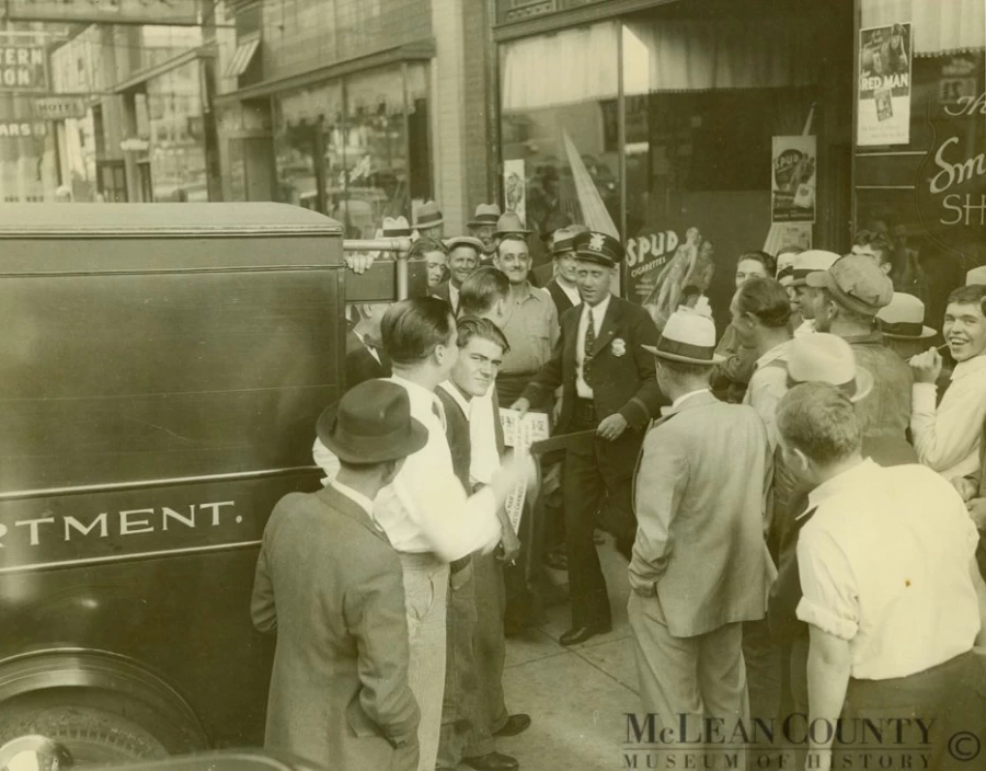 In early September 1935, the Smoke House, a cigar and tobacco shop at 216 West Washington Street, was one of several local establishments raided by the Bloomington Police Department. Authorities suspected that the Smoke House was home to an illegal gambling operation. Seen here is a lively crowd gathered to watch police officers remove alleged gambling and horse race betting paraphernalia from the business. This stretch of the 200 block of West Washington Street, from the Peoples Bank building (now Commerce Bank) west to Madison Street, was razed in the mid-1960s to make way for a drive-through banking facility
