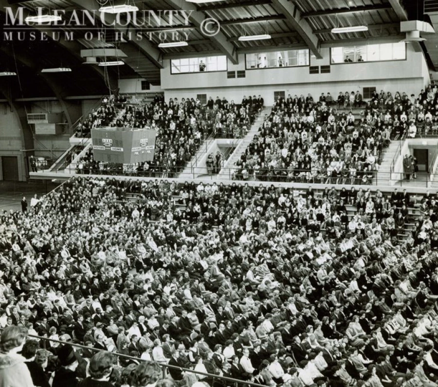 This week marks the fiftieth anniversary of the assassination of President John F. Kennedy, which occurred on the afternoon of November 22, 1963 in Dallas, Texas. Three days after the assassination, Monday, November 25, Illinois State Normal University held a special convocation in memory of the slain president. There were about 6,000 students, faculty, university staff and area residents at the ceremony in the newly erected Horton Field House.“I'm sure that where you were and what you were doing [at the time the news of the president's death came] will be imprinted on your mind forever," said a prescient ISNU President Robert G. Bone. The Vidette, the student newspaper, published a Sunday issue (the only one in its history) with the headline “Campus Mourns Kennedy's Death." More than 1,000 attended a similar memorial service at Illinois Wesleyan University, also on November 25. The program was held at what is today the Hansen Student Center. “We all reacted in disbelief that the life of one so powerful could vanish in a matter of seconds," said IWU Chaplain William L. White. “This raises the questions of 'What is life?' and 'What is death?'"