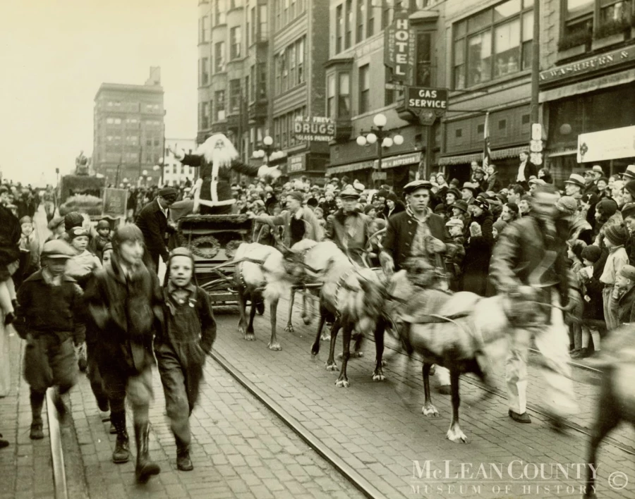 The annual Bloomington-Normal Jaycees Christmas Parade, held this year on Saturday, December 7, was the 84th edition of this local holiday tradition. Today Mr. and Mrs. Claus appear in a hook-and-ladder fire truck along the parade route, but back in 1929 Santa's sleigh was pulled by real live reindeer! That said, the lack of snowfall meant the “right jolly old elf's" sleigh featured wheels rather than runners. Seen here is the 1929 parade moving north on the 300 block of North Main Street.Merry Christmas from the Museum's staff and Board of Directors.To see this photo overlayed on Google Street View, check out our HistoryPin page
