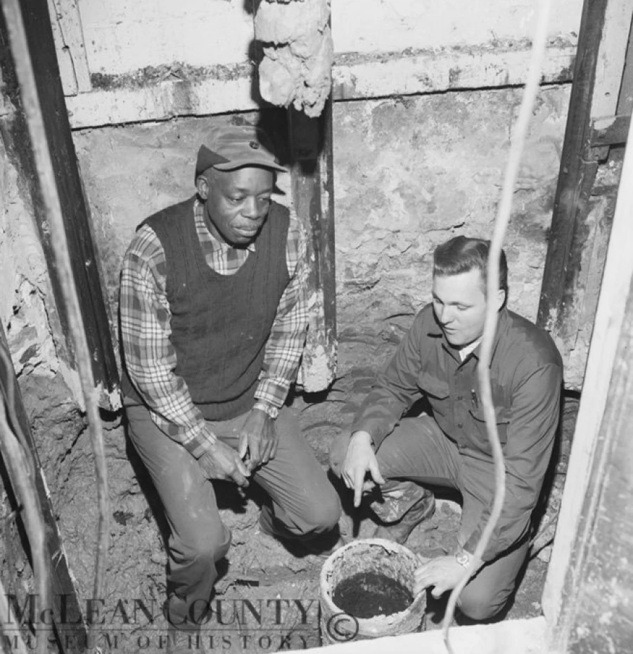 In November 1969, employees of Danville, IL-based Fairhall Elevator Co., while installing a new elevator at American State Bank on the east side of the Courthouse Square, were surprised to uncover remnants of an older elevator. Their discoveries included a 30 to 40-foot-long hydraulic tube buried at the bottom of the shaft, equipment that likely dated to a time when the building was the Metropole Hotel more than a half century earlier, back when elevators operated with water hydraulics.Seen here are Kerney Poole (left), an American State employee, and Roy Stoller of Fairhall. Renovations and new construction in older downtown buildings often brings surprises, then and now! “Sometimes you just don't know what you're getting into when you start a job," quipped one Fairhall employee.For a history of American State Bank, see Museum Librarian Bill Kemp's “A Page from Our Past" column in last Sunday's Pantagraph here: tinyurl.com/kuf7ka6