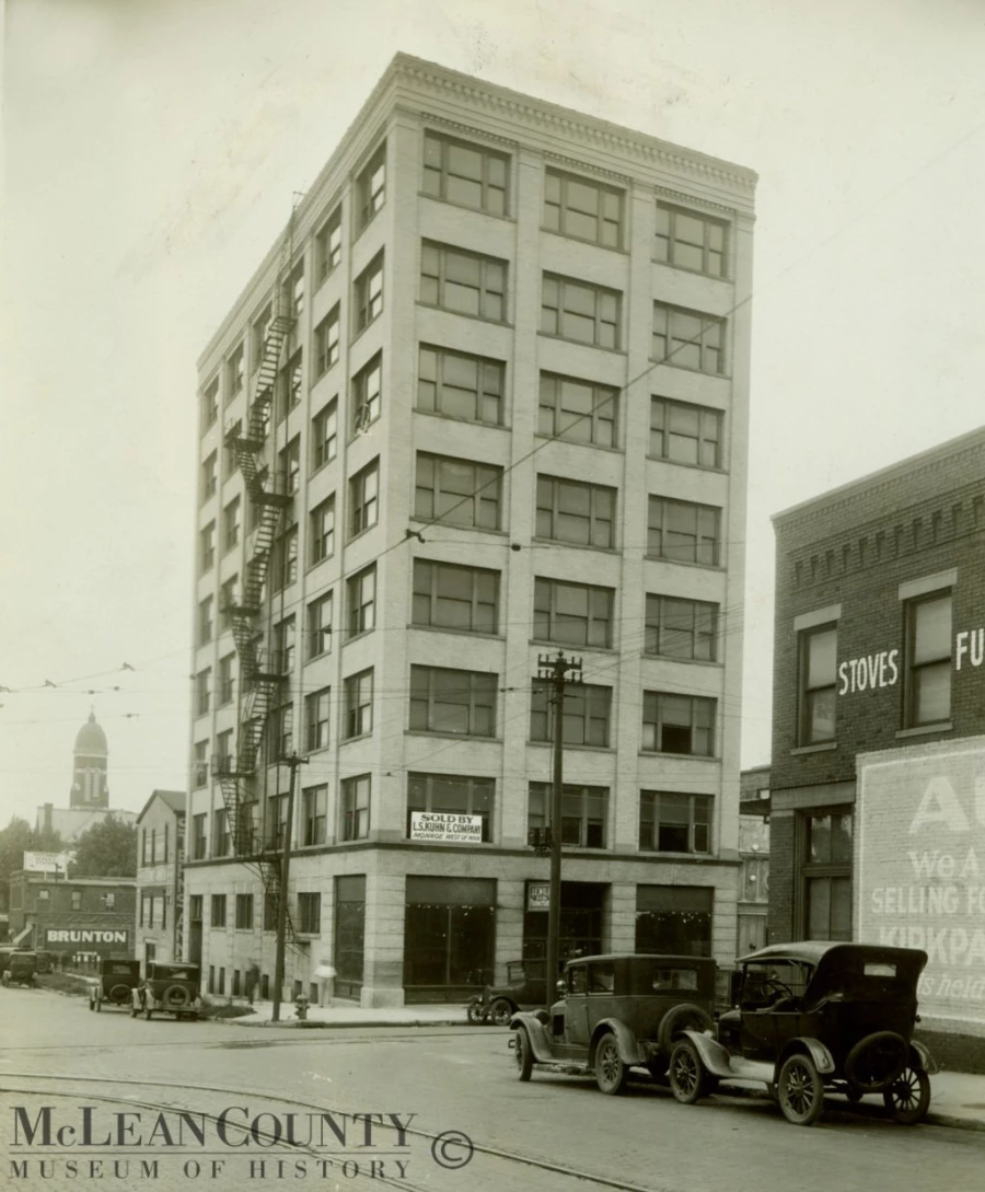 Located at the northeast corner of Center and Market streets, this downtown landmark dates to 1913 when it first served as an addition to the J.E. Will Furniture Co. building on North Main Street. Designed by local architect George H. Miller, this steel-frame “high-rise" with cream-colored glazed brick, was the tallest building in Bloomington upon its completion. McKnight & McKnight, a local publishing firm, moved into the building about the time of this photograph. The company published education-related titles in fields ranging from geography to the industrial arts. Today, this building is a senior residential tower known as The Downtowner.