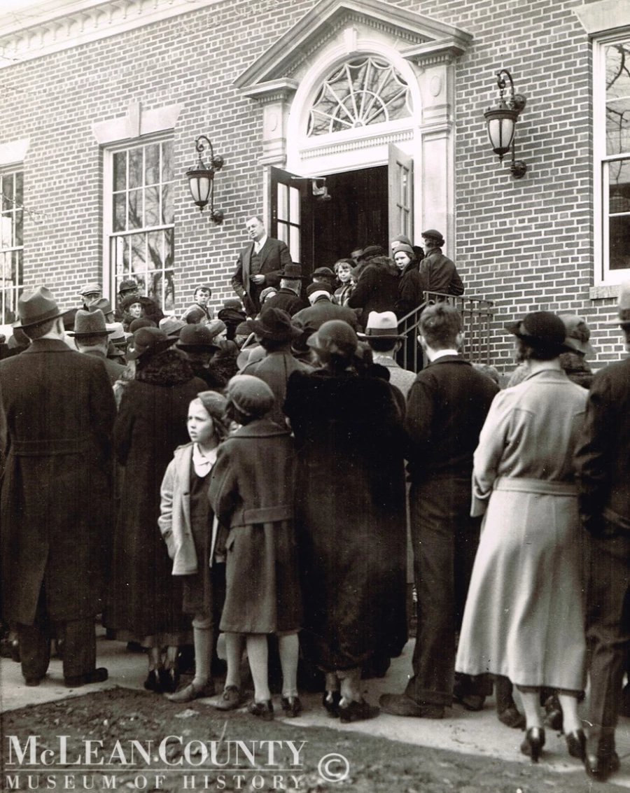 The ceremony included a talk by Illinois State Normal University President Raymond W. Fairchild (seen here on the front steps), and briefer remarks by Postmaster Thomas B. Raycraft and Normal Mayor Grant M. Ridenour. “Over its counters," Mayor Ridenour said of the new post office, “will flow the messages of the social and economic life of our community for years to come."