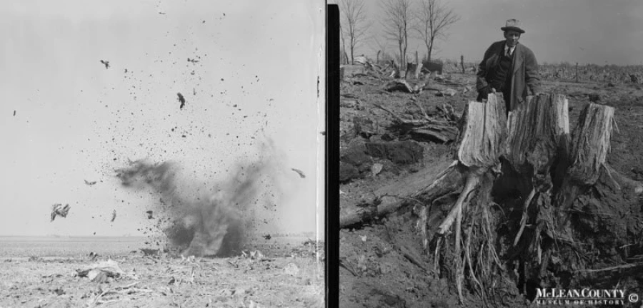 400 pounds of dynamite subdue cottonwood, hackberry stumps. These two photographs appeared in the March 27, 1937 Pantagraph. The original caption read, in part: “Three acres of cottonwood and hackberry stumps were blasted out last week on the Henry W. Capen farm southeast of town [Bloomington], operated by Fred Blum." The first photo “reveals bits of a huge stump 12-feet across at the base, flying through the air. 'Heads up' was the order given to watchers who had to dodge the bits of roots and earth as they descended." The second photo shows Henry Capen next to one stump shattered by such an explosion. These images are now in the collections of the McLean County Museum of History. Still removing timber from the original Blooming Grove as late as 1937? Or are the cottonwood and hackberry typical of small stream ecology and this is the channelization of waterway to increase arable land and be more forgiving of mechanical farming?Any thoughts on this one?