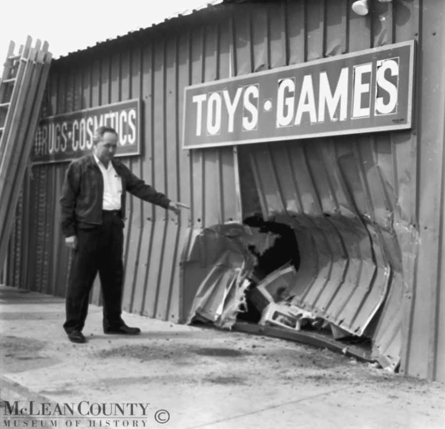 On August 18, 1963, 19-year-old David C. Roberts of rural McLean County accidentally plowed his car into—and through—Adolph's Discount Store, located in the “Brandtville" corner of Illinois 150 and the U.S. 66 “Beltway" (now Veterans Parkway). Luckily, Roberts and his two passengers, as well as several customers inside (yes, the store was open), came away unscathed. Roberts told police his brakes somehow failed as he pulled up to the business. That's owner-manager Adolf A. Brooks' outside his store pointing to the damage. Many longtime area residents will remember this store, which opened in November 1961. Brooks' “Adolf Sez" advertisements spoke to an era of madcap, wily, harried, and tireless discount retailers. “Adolf sez whut ain't on the shelf is on the floor. We got it somewhar!" went one of his many folksy sales pitches. Brooks, who passed away in April 1995 at the age of 72, operated Adolf's until 1984.