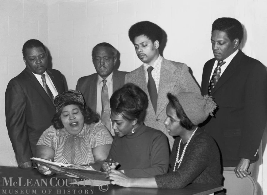 On February 15, 1972, the Minority Voters Coalition of Bloomington-Normal elected officers during a meeting at the Sunnyside Neighborhood Center (now known as the Lawrence Irvin Neighborhood Center) on the far west side of Bloomington. The goal of the group was to both register and educate minority voters. Seen here, front row, left to right, are Marguerite Jackson, Eva Jones, and Dorothy Stewart. In the back row, left to right, are Robert Gaston, Henry Brown, David May, and Dr. Charles Morris, an Illinois State University mathematics professor.