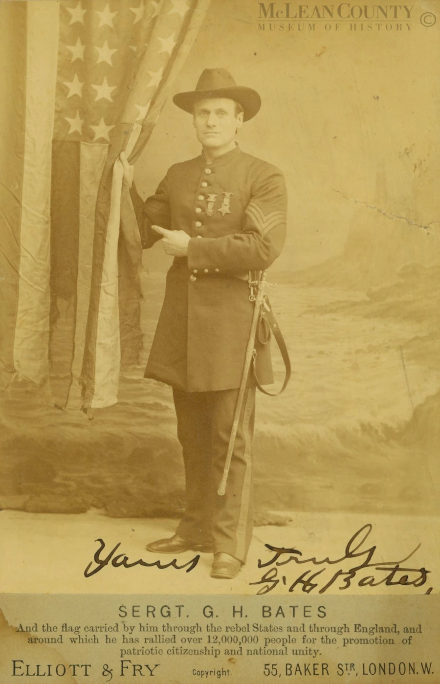 The commercially manufactured 4¼ by 6½ inch "cabinet card" seen here was used to promote Bates' patriotic trek through England. He passed away in February 1917 and is buried at Cheney's Grove Township Cemetery in Saybrook.