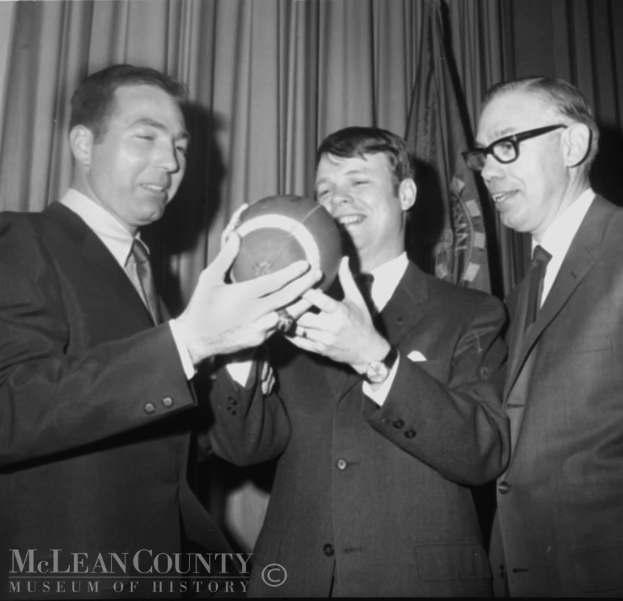 Famed Green Bay Packers quarterback Bart Starr was the keynote speaker at the March 26, 1969 Normal Chamber of Commerce banquet. There were 700 diners packed into what is now Illinois State University's Brown Ballroom in the Bone Student Center* to hear Starr deliver a motivational speech on goals and the five keys—preparation, practice, desire, prayer, and humor—to achieve them. Seen here (left to right) are Starr, incoming Normal Chamber of Commerce President James L. Fisher, and outgoing President Richard A. Lenahan. Starr played for Green Bay from 1956 to 1971, leading the Packers to victory in Super Bowls I and II (1967 and 1968). Fisher, who at the time was ISU vice-president and dean of Information and Research Services, would leave Normal in the fall of 1969 to become president of Towson State College (now Towson University) in Maryland. He served as Towson president to 1978, and has remained active in higher education circles ever since. Lenahan enjoyed a 35-year career with The First National Bank of Normal, becoming president in 1979. He retired in 1996 and passed away in July 2012 at the age of 86. *EDIT: this dinner was held at the old Student Union. The Bone student center would open 5 years later. Thanks to Bill Hammitt for catching the mistake!