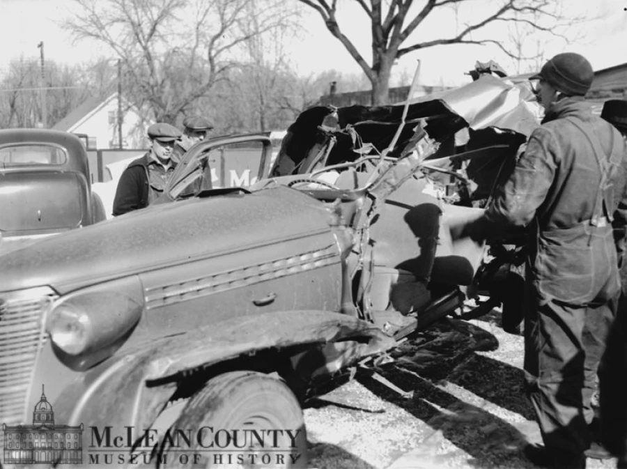 On Friday, February 3, 1939, four area men were killed in a late evening automobile accident on U.S. Route 66, about 2 miles south of Chenoa. The crash took the lives of Carl Weymouth, owner and driver of the car, Paul Trunk, Sr., Nelson Francis, and Claude M. See. A fifth passenger, Roy Entwistle, was slightly injured. The men had left Bloomington and were on their way back home to Chatsworth. A Missouri truck driver, E.J. Spaulding, was southbound when he swerved to avoid a snowdrift extending onto the road. Weymouth's car then struck the truck and rolled some 140 feet. Spaulding was not injured.