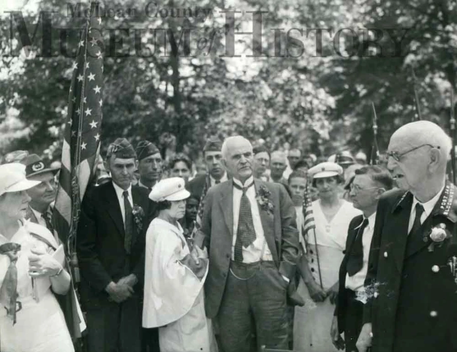 The gentlemen in the center is Joseph “Private Joe” Fifer of Bloomington, who served as Illinois governor from 1889 to 1893. For Memorial Day 1934. Fifer, a Civil War veteran, recited Lincoln’s Gettysburg Address to a crowd gathered at Bloomington Cemetery (now part of Evergreen Memorial Cemetery). On the right is A.T. Ives, another Civil War veteran.