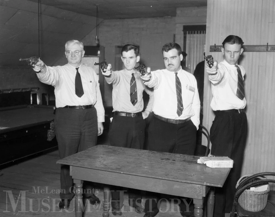 Seen here are four members of the Bloomington Police Department taking target practice with their Smith & Wesson .38 service revolvers. The more industrious members of the BPD had earlier converted a hayloft in the garage wing of old City Hall (located at the northwest corner of East and Monroe streets) into a combination clubroom and firing range!That’s Police Chief Paul F. Giermann on the left and Patrolman Cecil Richardson on the right. The two officers in the middle are unidentified.