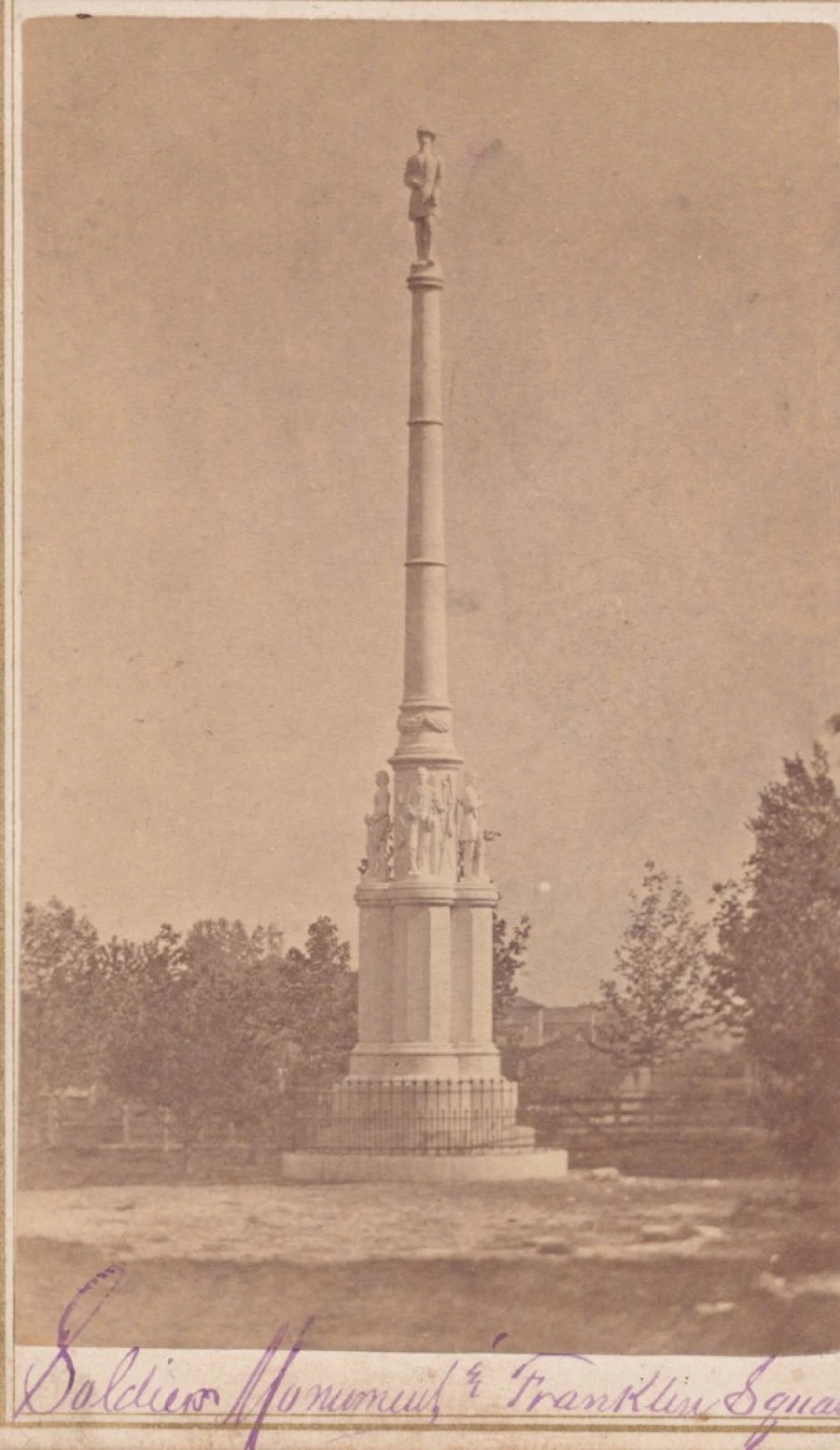McLean County has long honored its war dead. In 1869, local officials saw to the erection in the center of Franklin Park a monument featuring the names of some 700 Civil War dead from McLean County. Yet due to the poor quality of the marble and the monument’s subsequent deterioration, it was taken down in 1914. The lower half, though, survives today as a ghostly remnant in Bloomington’s Briarwood neighborhood.