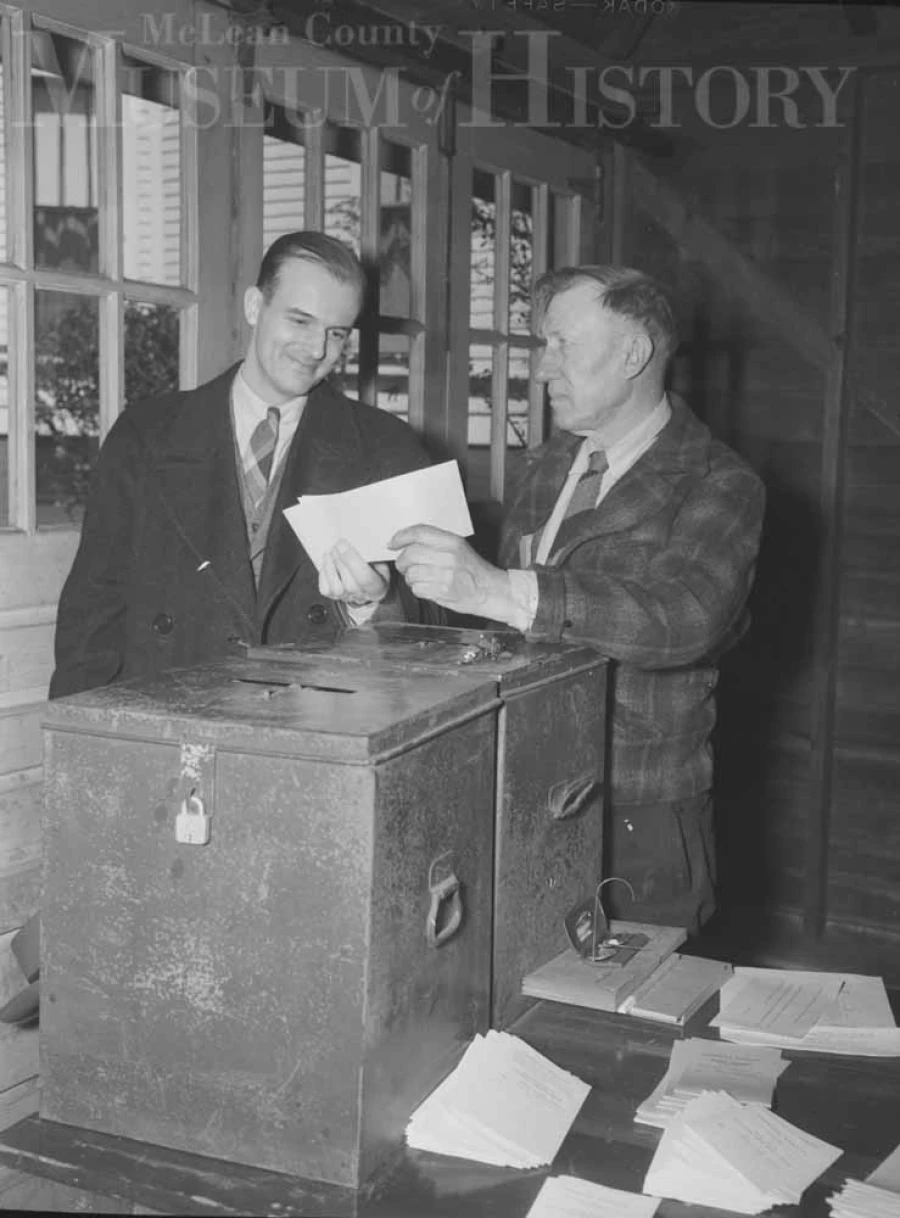 Seen here is 30-year-old judicial candidate Robert C. Underwood (left) at an unidentified Town of Normal polling station, casting his ballot in the spring 1945 election. Underwood, in his first bid for elective office, would defeat sitting County Judge Dewey Montgomery by a nearly two-to-one margin.Underwood would serve as County Judge until 1962, and then get elected to the Illinois Supreme Court, where he would remain until 1984 (and serve as chief justice from 1969 to 1976). He passed away in 1988.